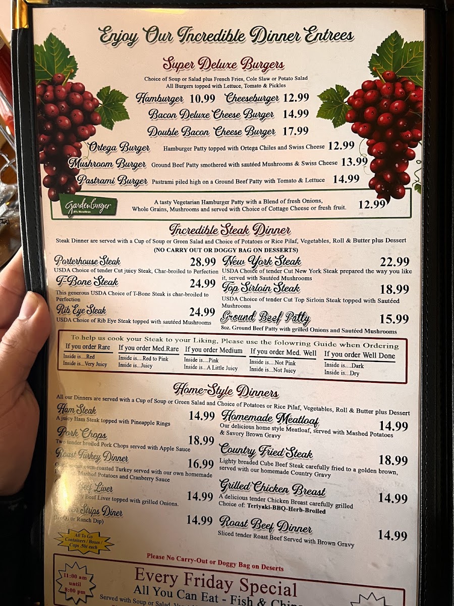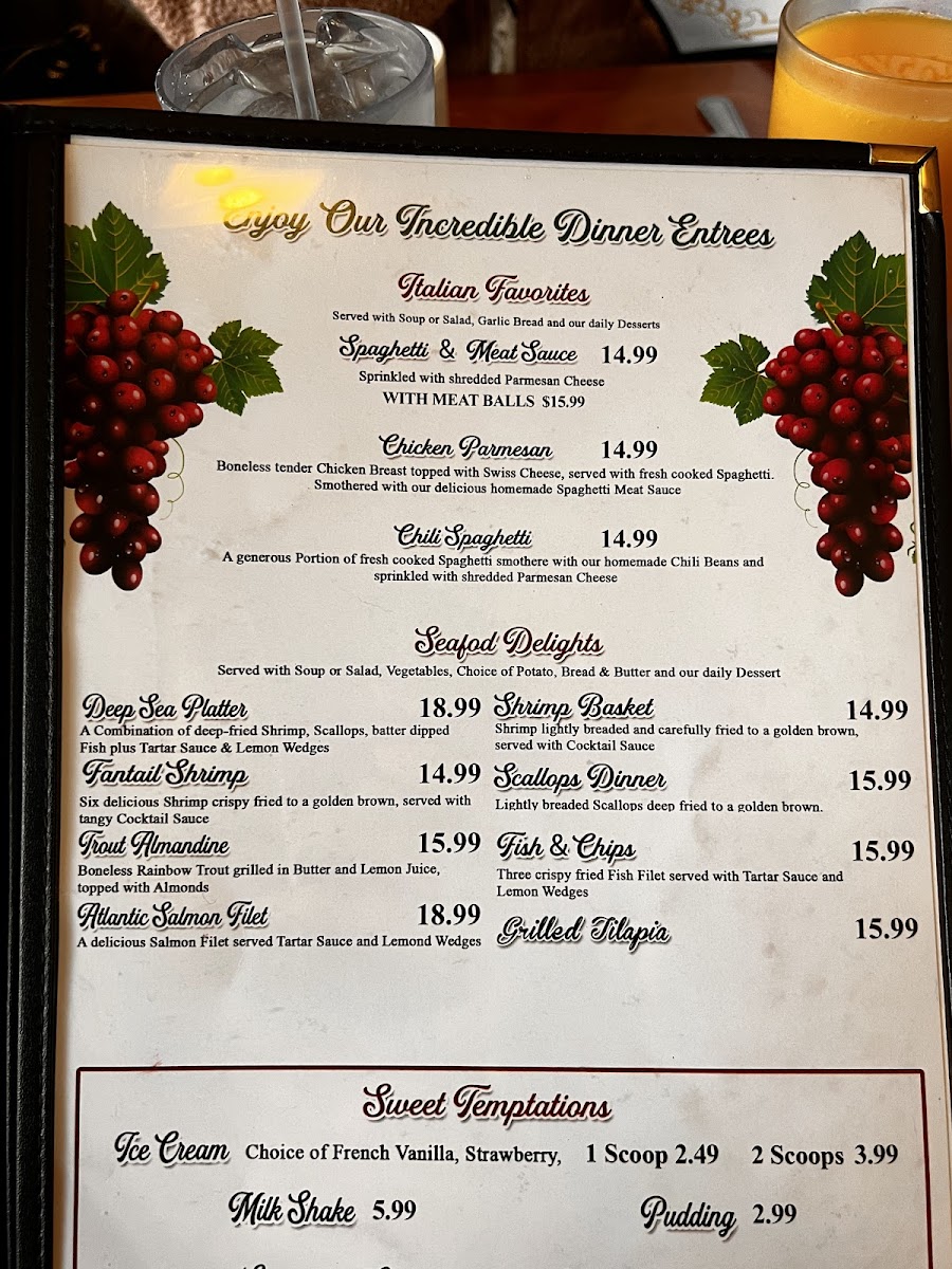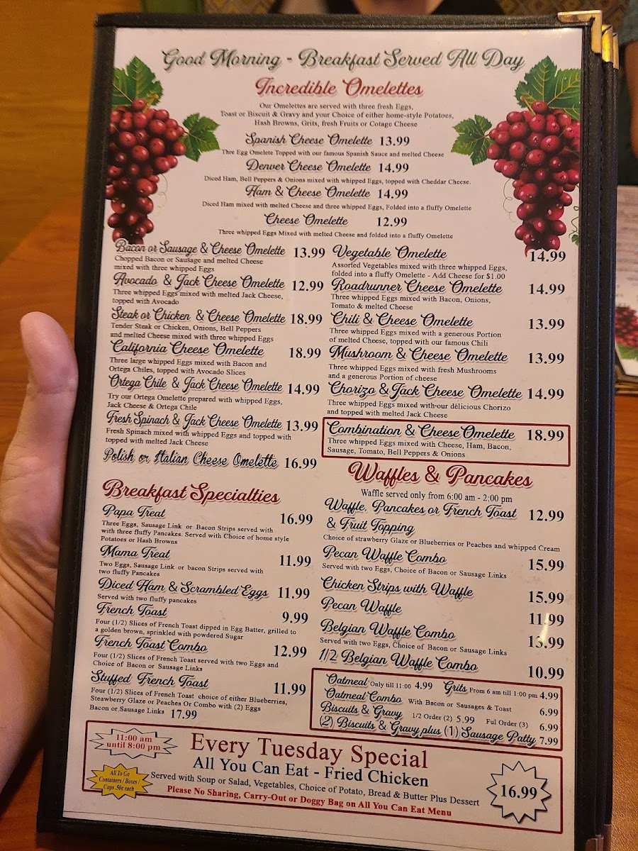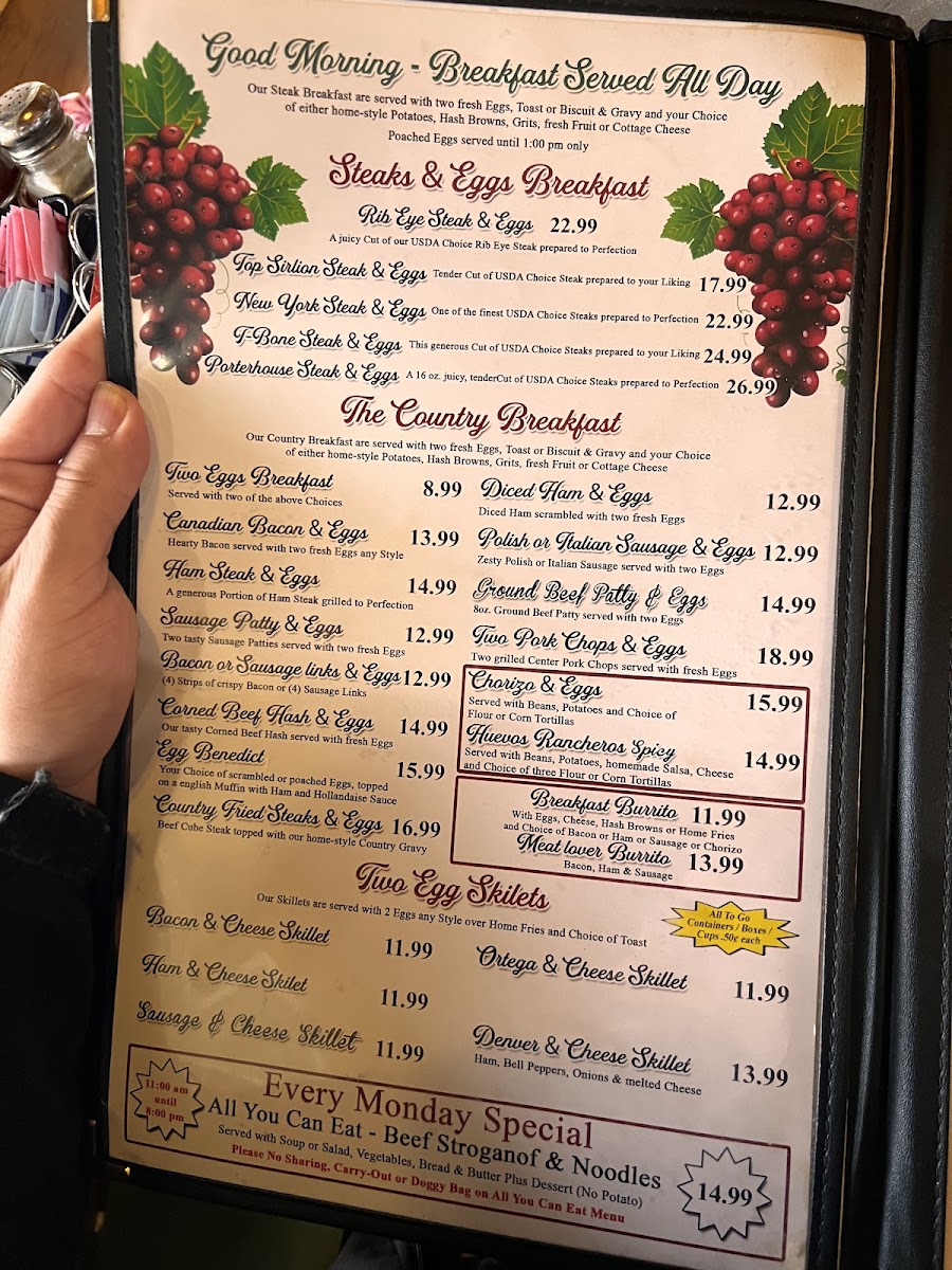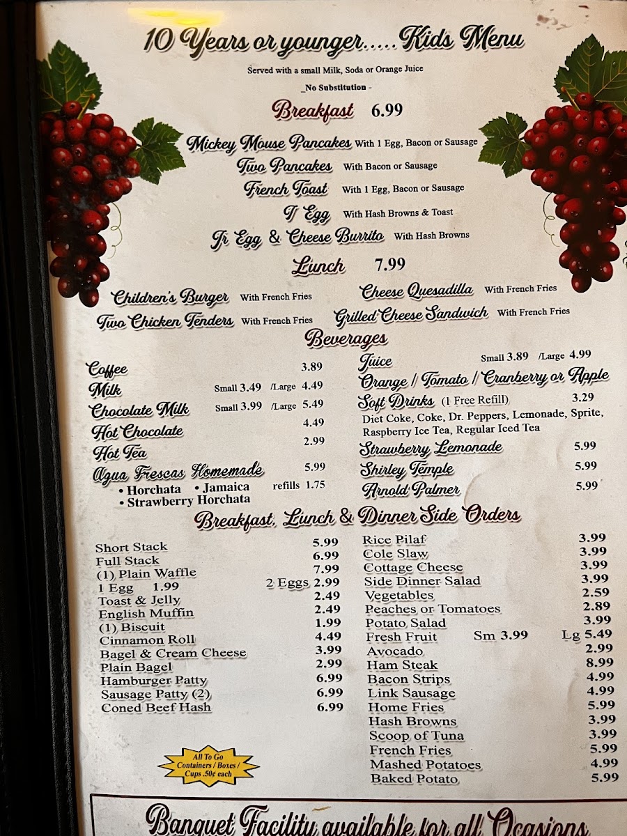 This menu suits various meal occasions including breakfast, brunch, and casual lunch or dinner dining. The variety accommodates quick orders as well as more leisurely family meals.